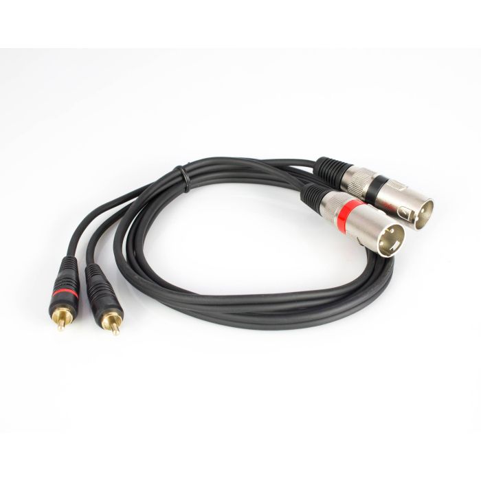 Audiokabel mit zwei männlichen Cinchsteckern und zwei männlichen XLR-Steckern. Adapterkabel zum Verbinden verschiedener PA-Geräte wie beispielsweise Mischpulten und Boxen.
