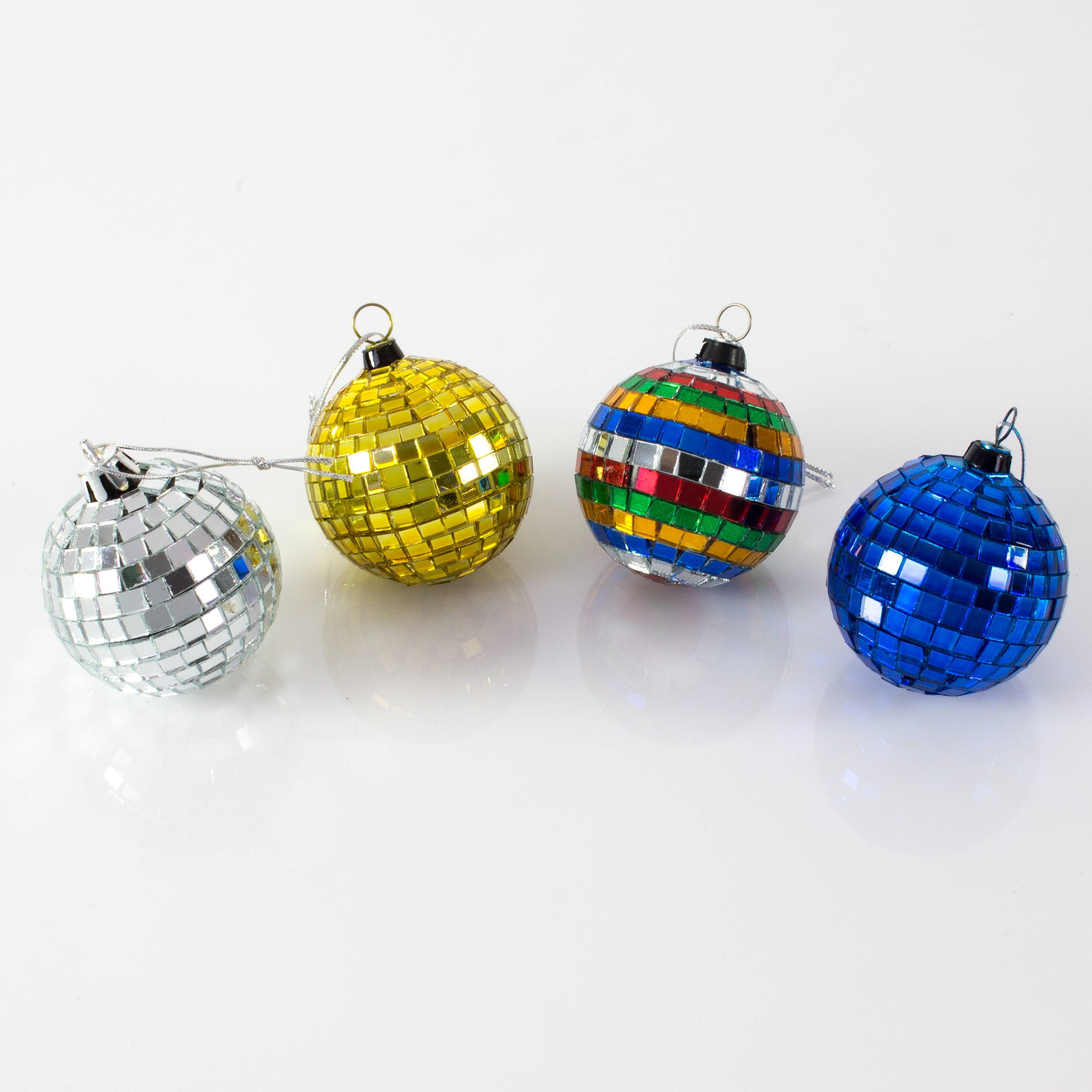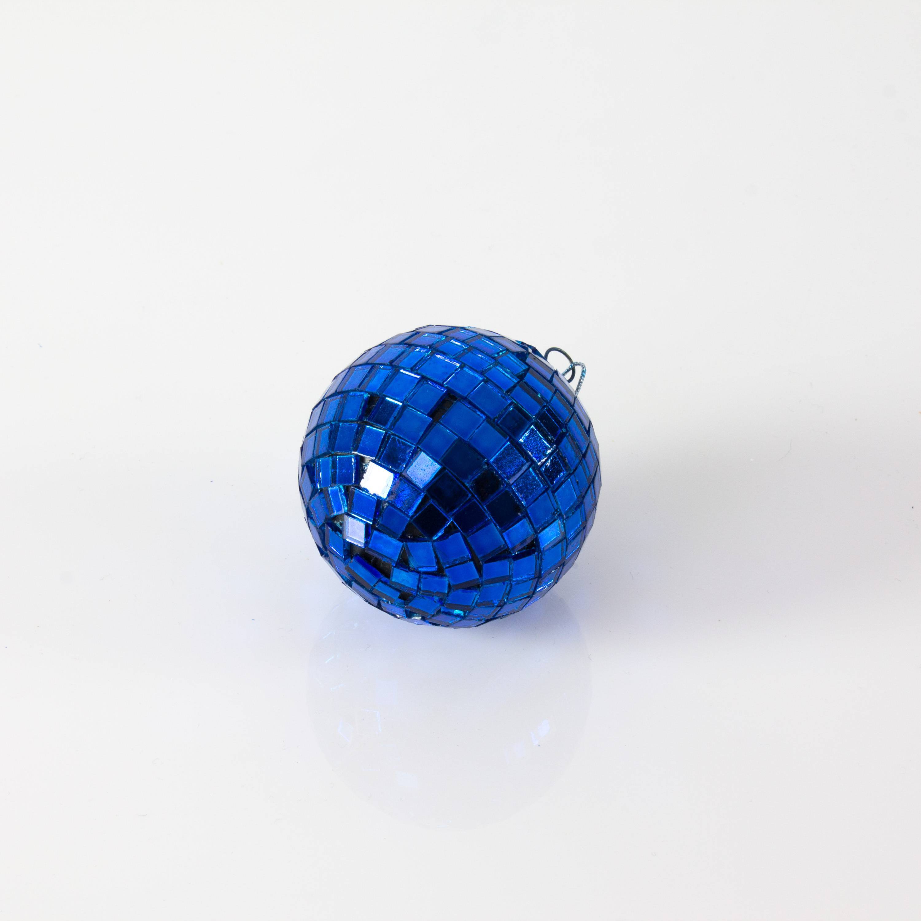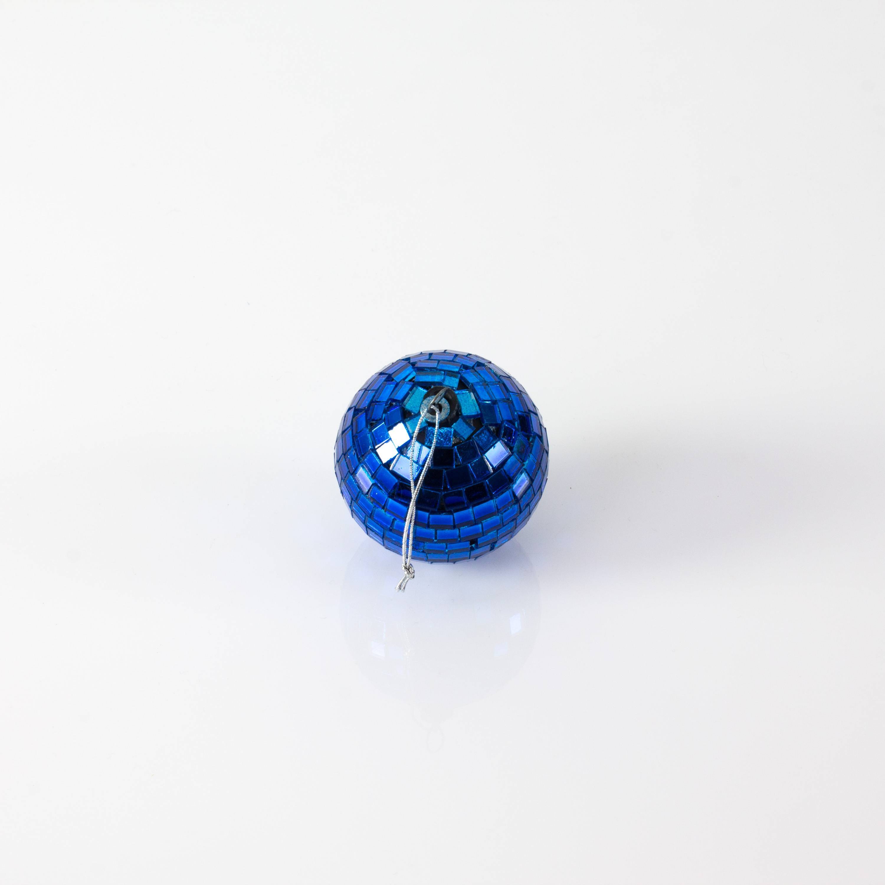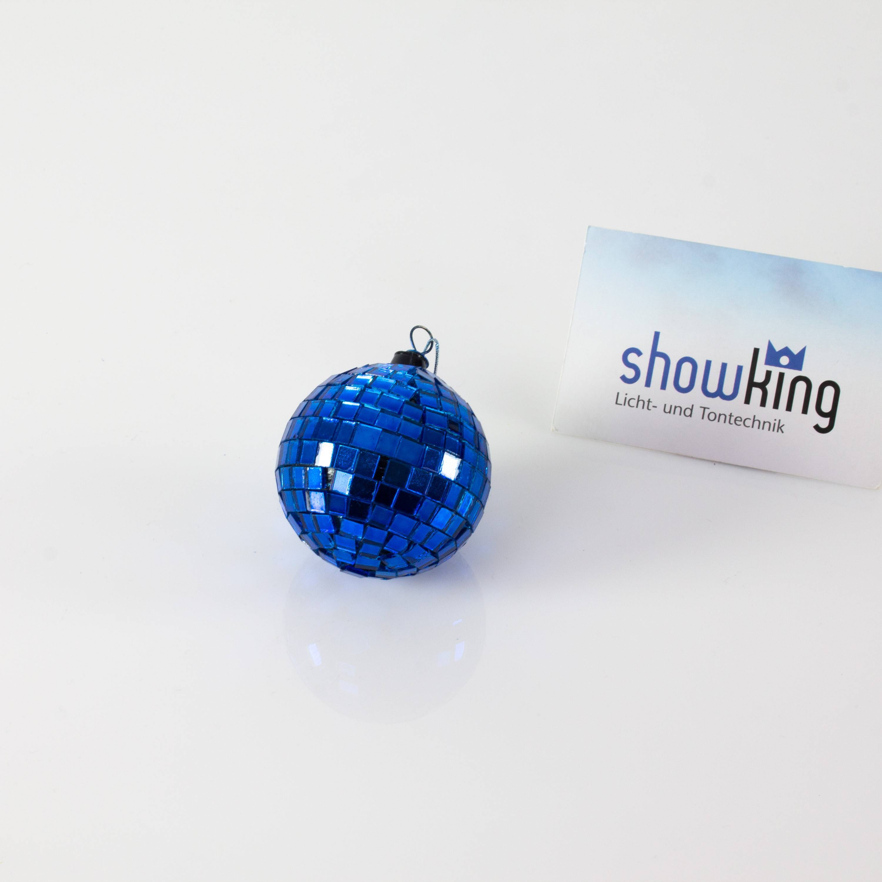 Die kleine Spiegelkugel WATERLOO in Blau mit dicht verklebten Facetten aus Glas und angebrachter Halteöse. Die ultimative Dekoration der 70er und 80er Jahre Disco ära für jeden Anlass, ob im Kinderzimmer, Partykeller, am Autorückspiegel oder auf der Firmenfeier.