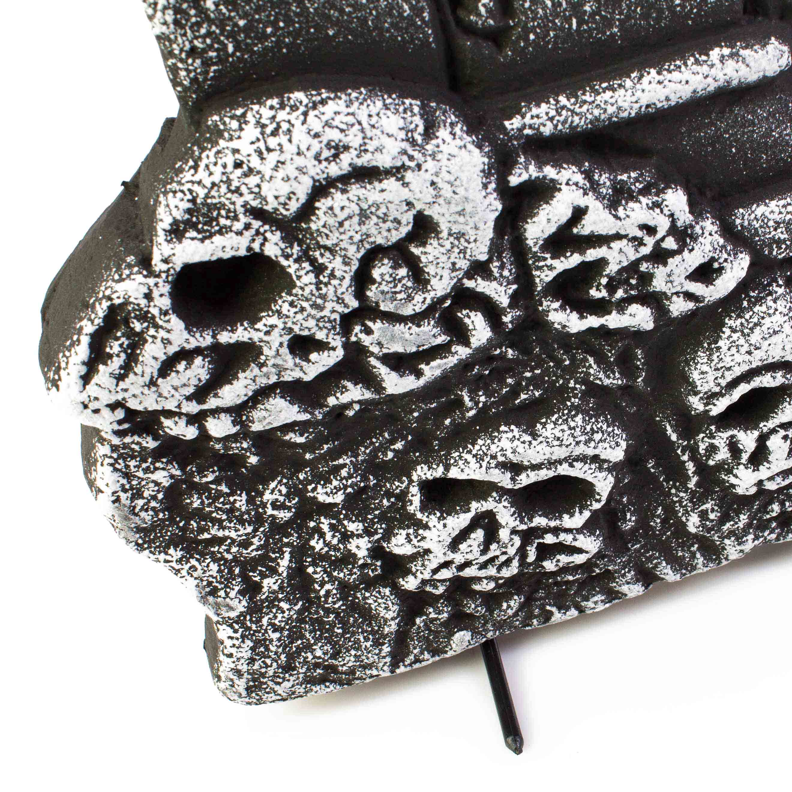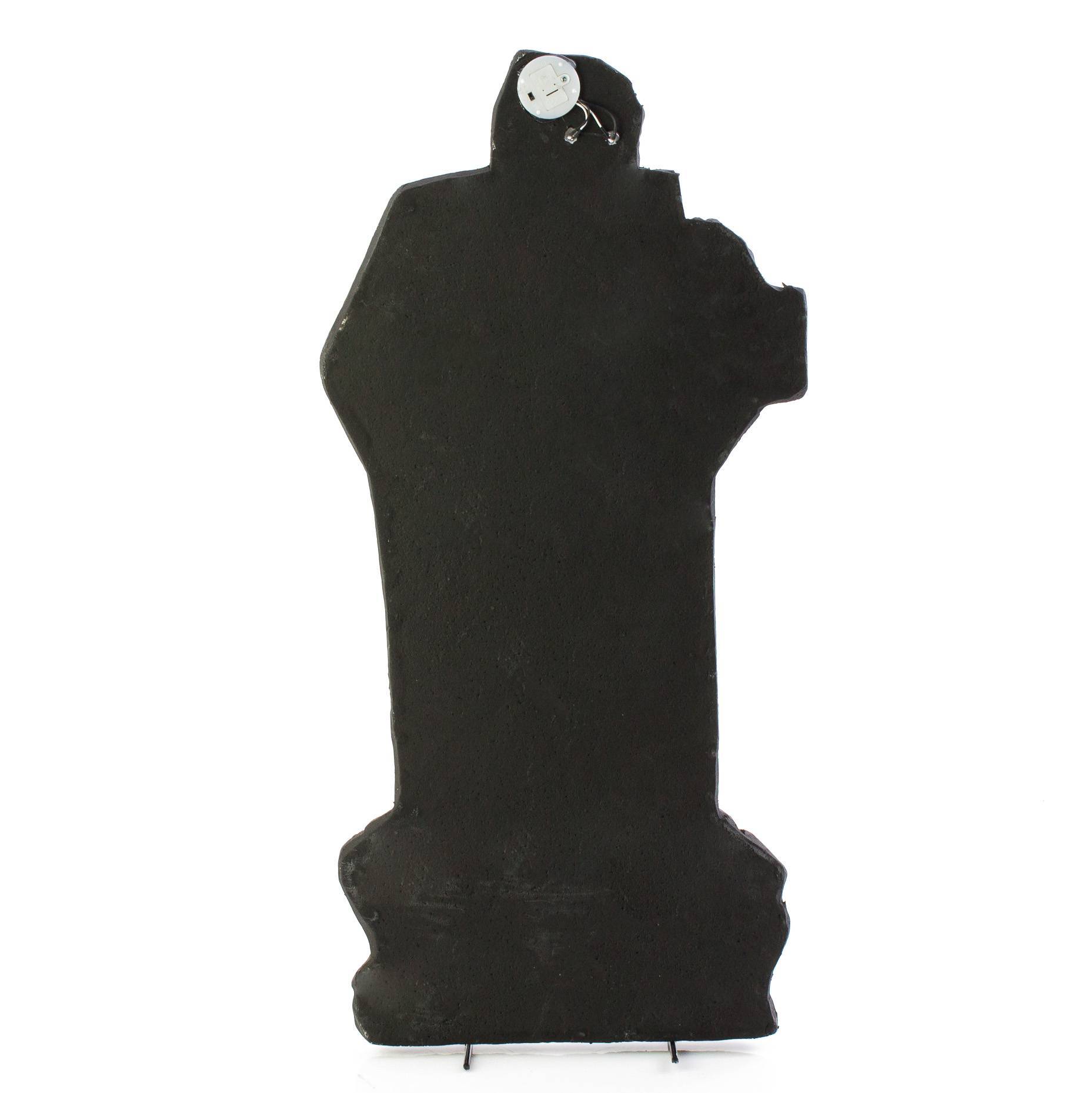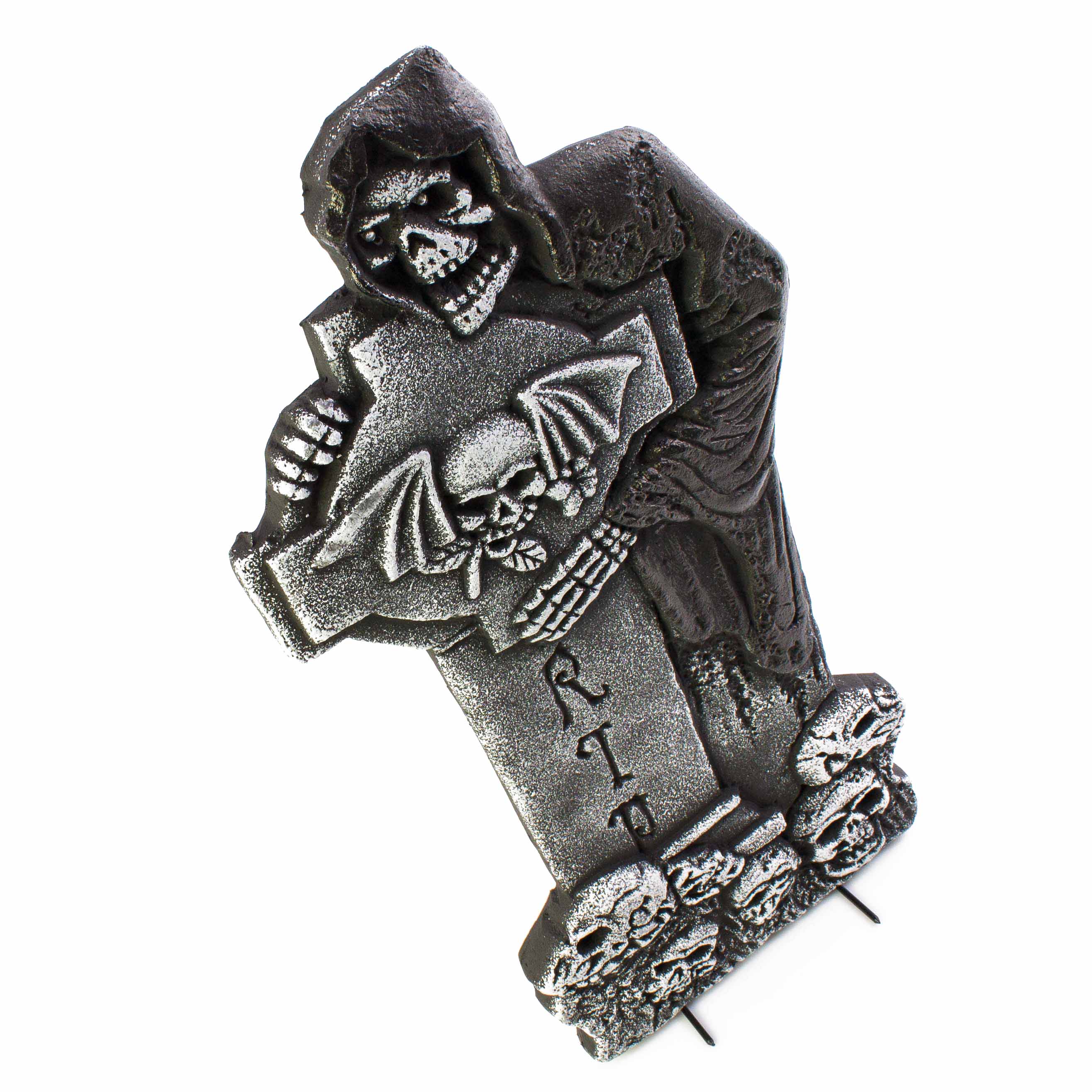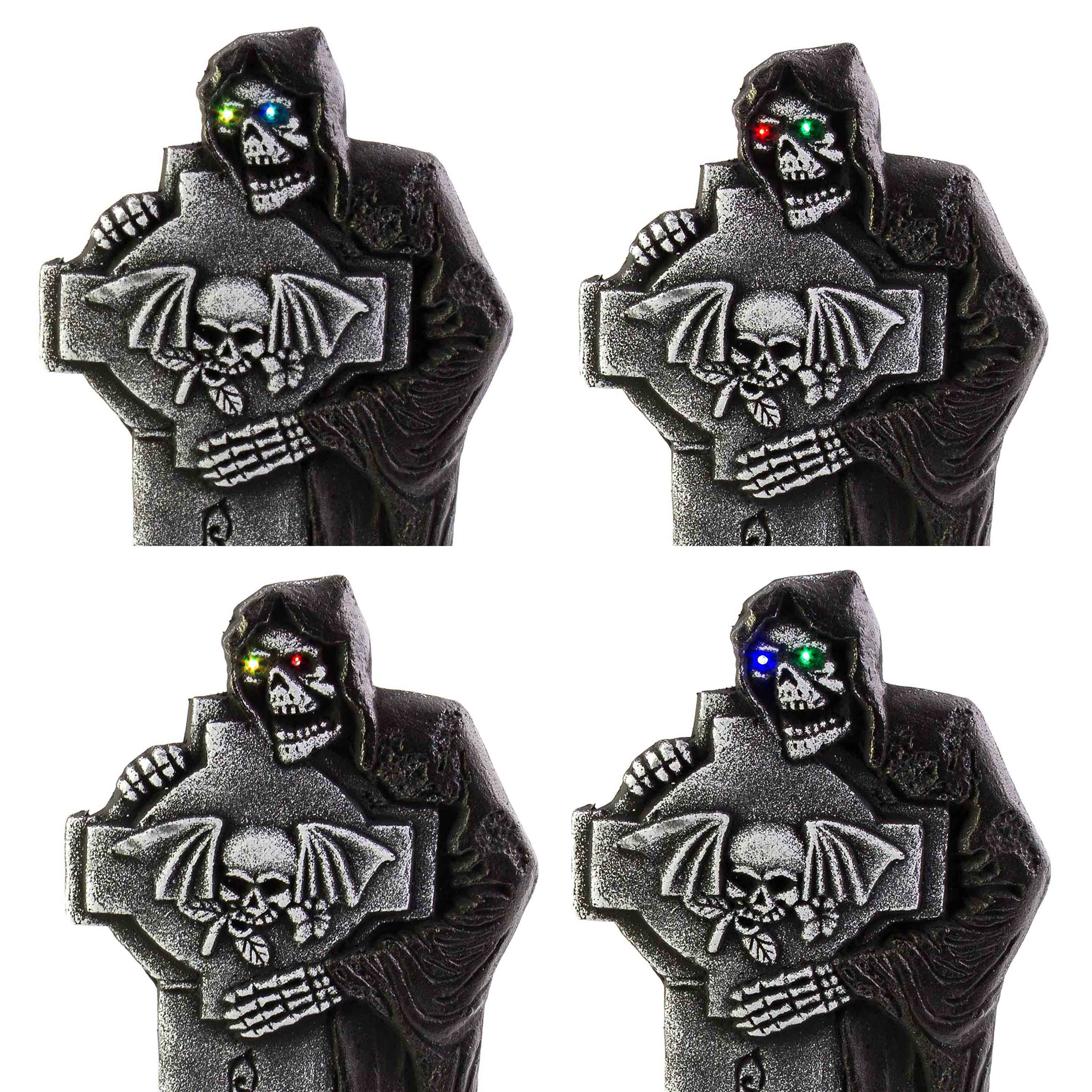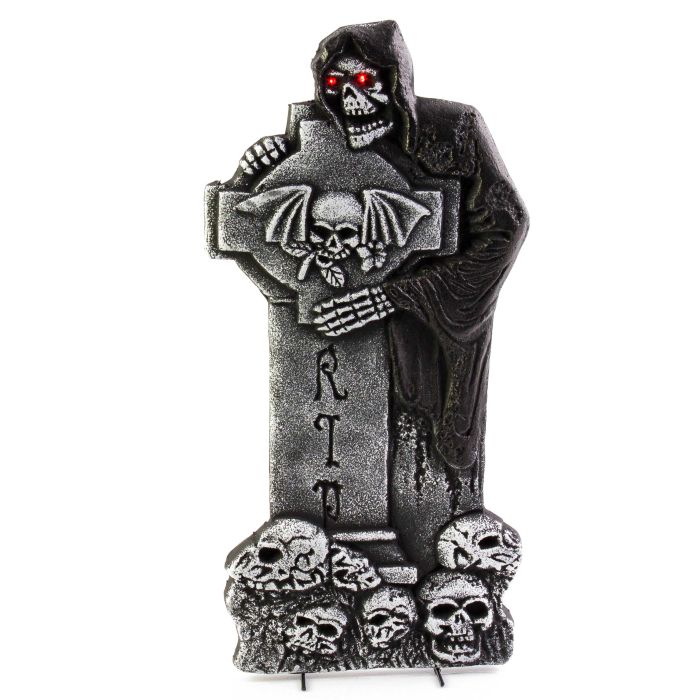 - Grabstein mit dem Schriftzug RIP und Skelett Sensenmann mit LED Augen (leuchten in verschiedenen Farben) sowie mit vielen Totenköpfe unterhalb des Kreuz Grabsteins