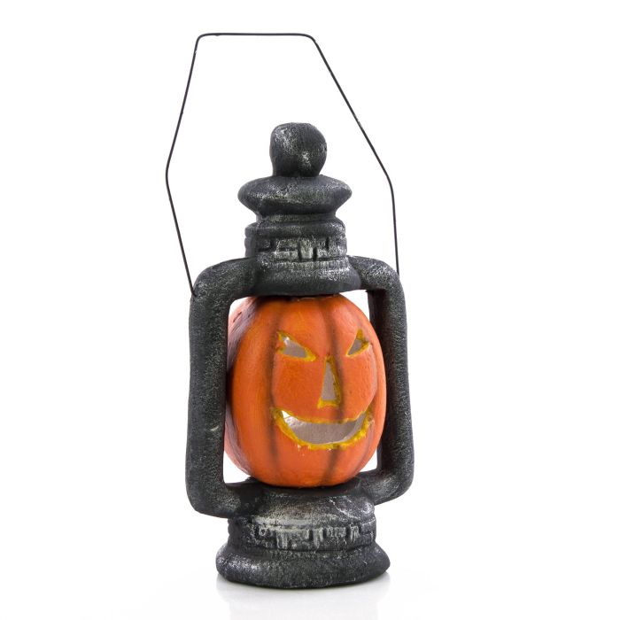 - Die Laterne besitzt einen Metallgriff und als Verzierung einen Totenkopf abgerundet wird das Gesamtbild durch einen Orange farbigen Kürbiskopf mit Gesichtsschnitzereien aus Styropor