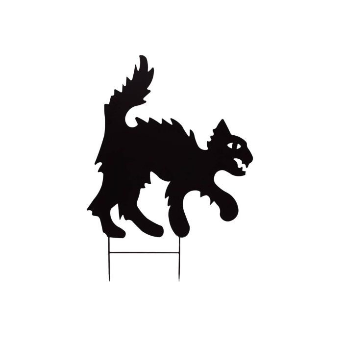 Schattenriss SPOOKY CAT in Farbe Schwarz. Die Silhouette ist auf 2 Erdspießen befestigt und ist perfekt für die Gestaltung des Gartens an Halloween geeignet.
