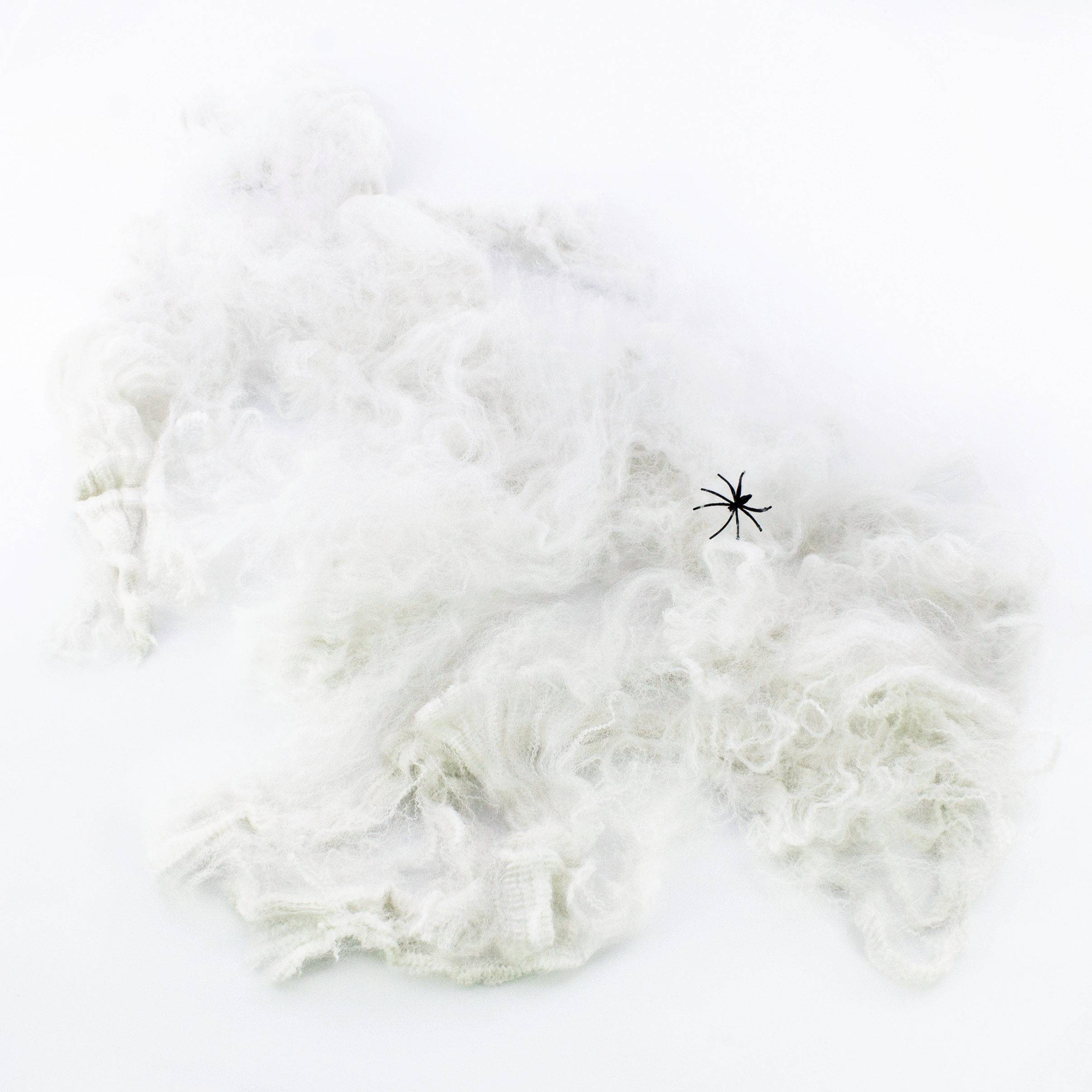 Künstliches, weißes Gewebe FORMIA, das im Dunklen leuchtet UV-Aktiv, in einer 100 g Packung. Aus dem feinen Material lassen sich realistische Spinnennetze gestalten ein Must Have auf jeder Halloween Party.