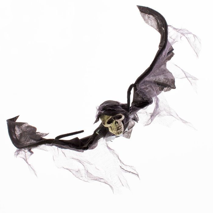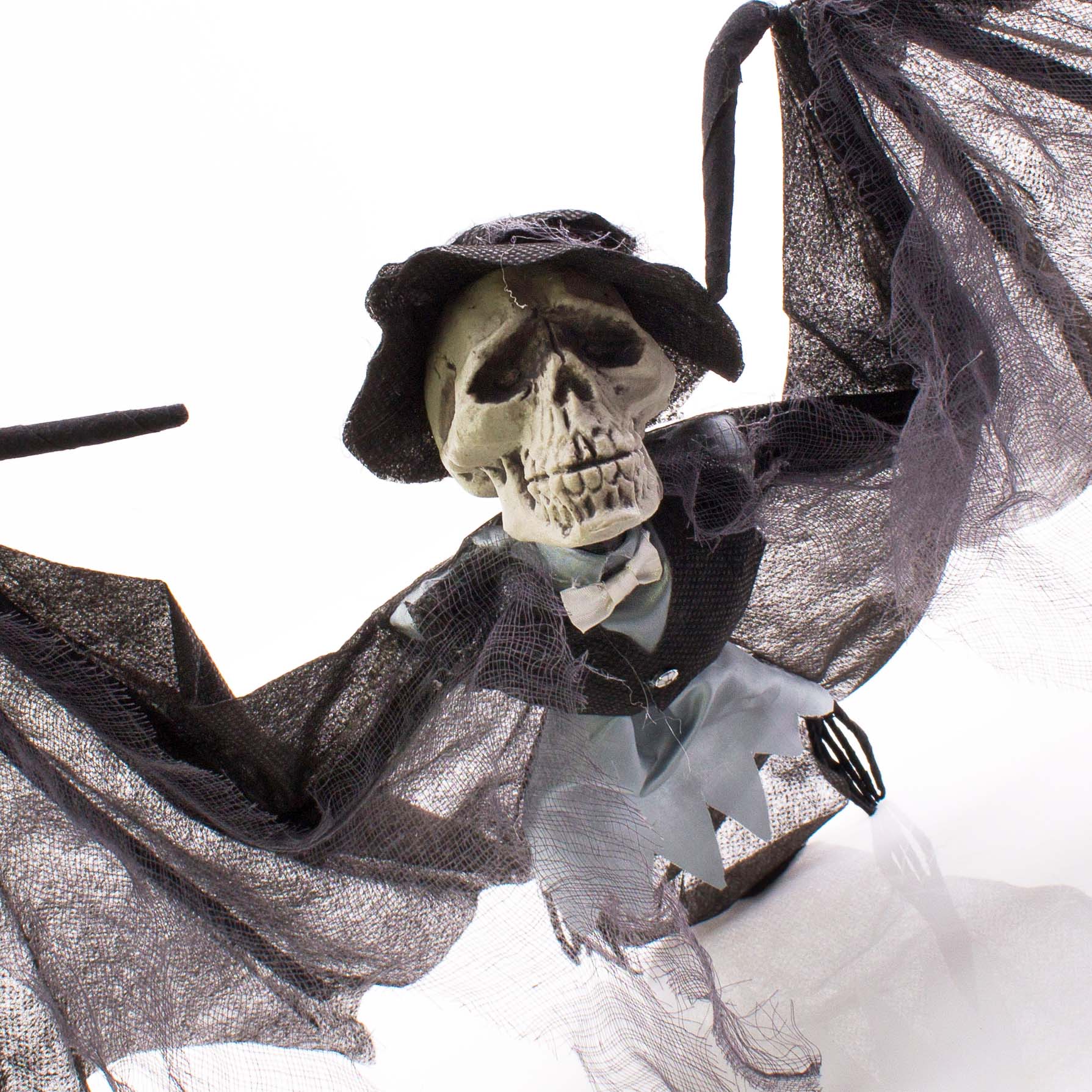 Halloween Fledermaus ZORRY im eleganten Anzug mit Hut zum Hängen. Die Vampir Fledermaus mit Totenkopf hat eine Spannweite von ca. 85 cm und ist super zur Keller Dekoration.