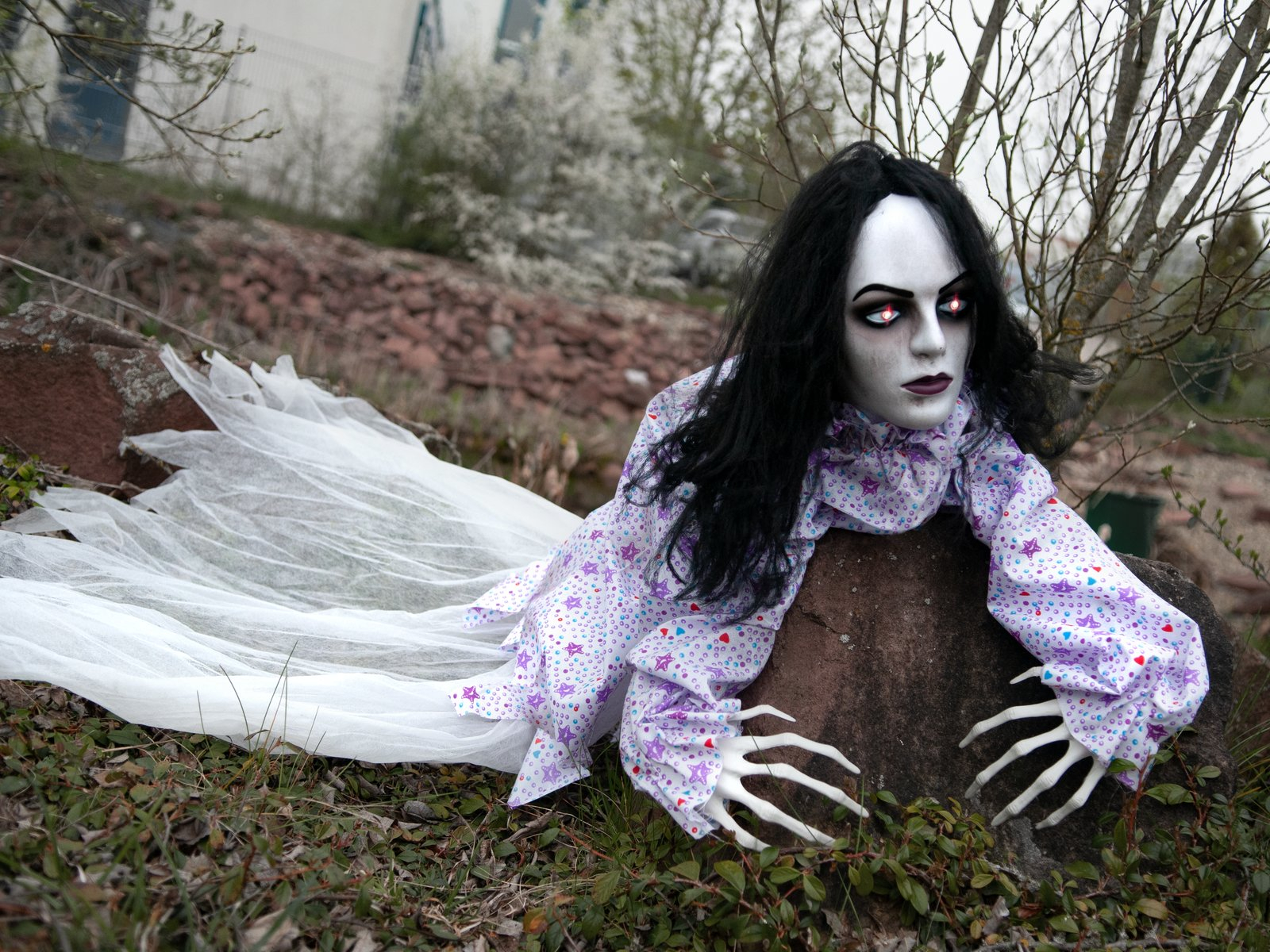- Gemustertes Kleid, lange schwarze Haare und bleiches Gesicht untermalt mit rot blinkenden LED Augen und formbaren Armen
