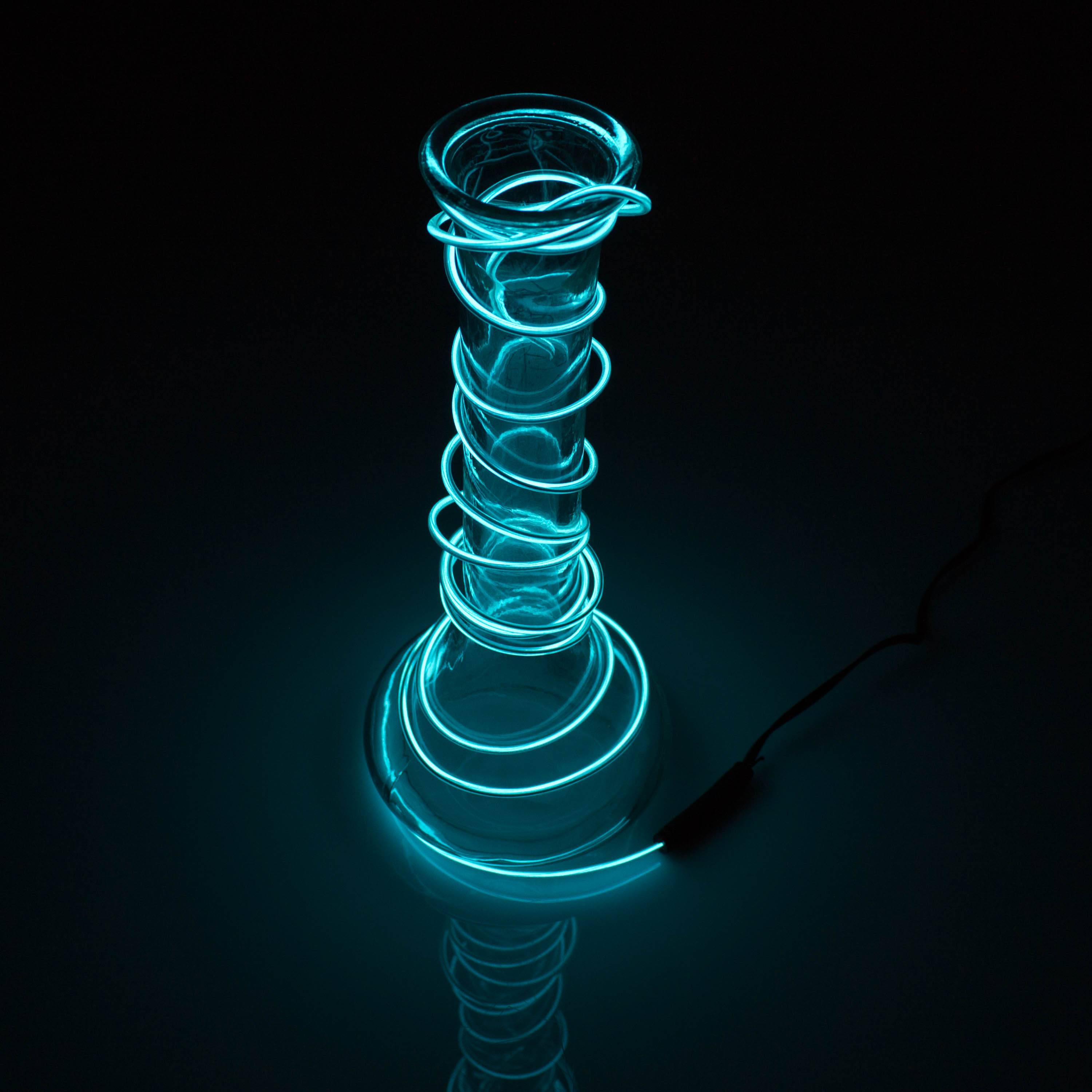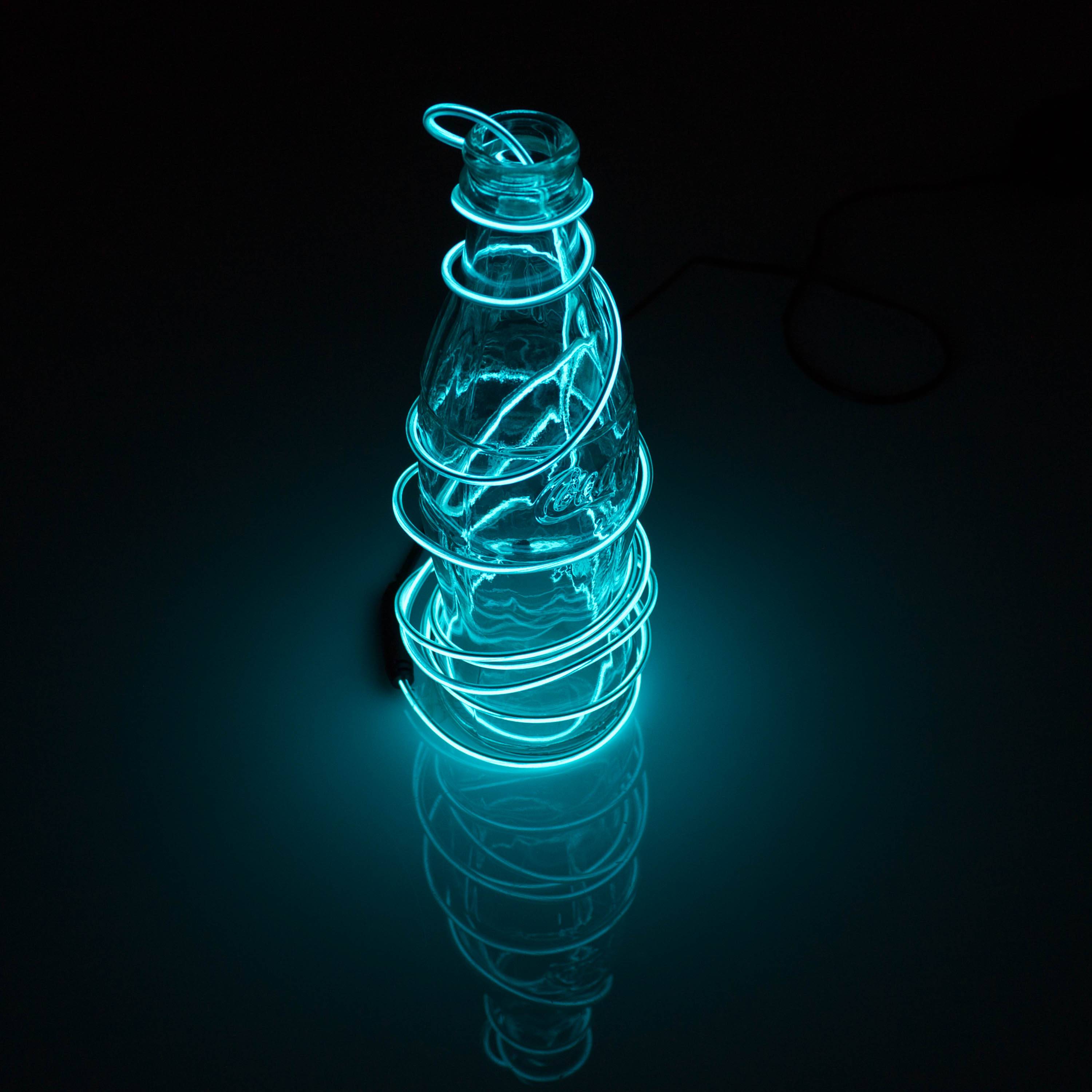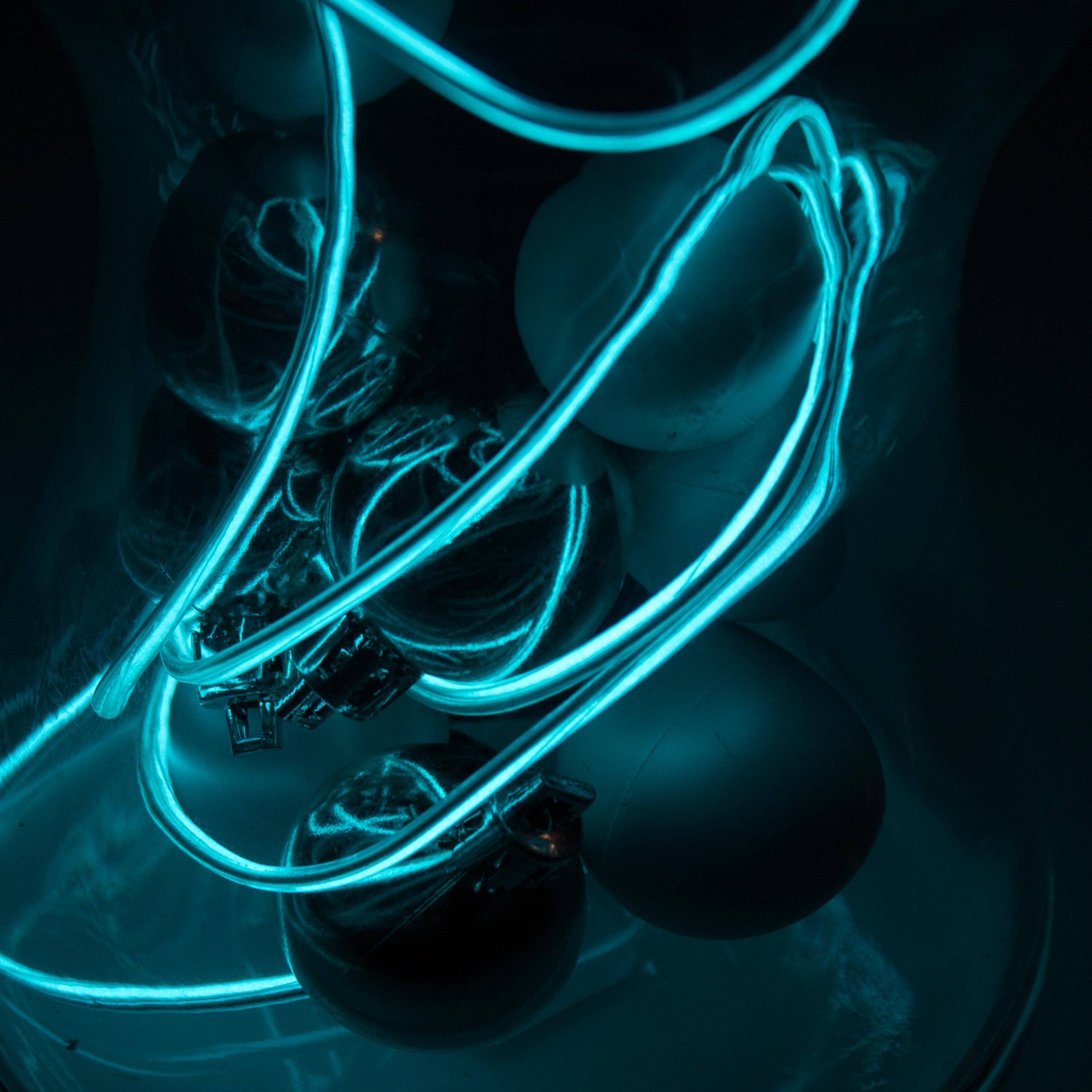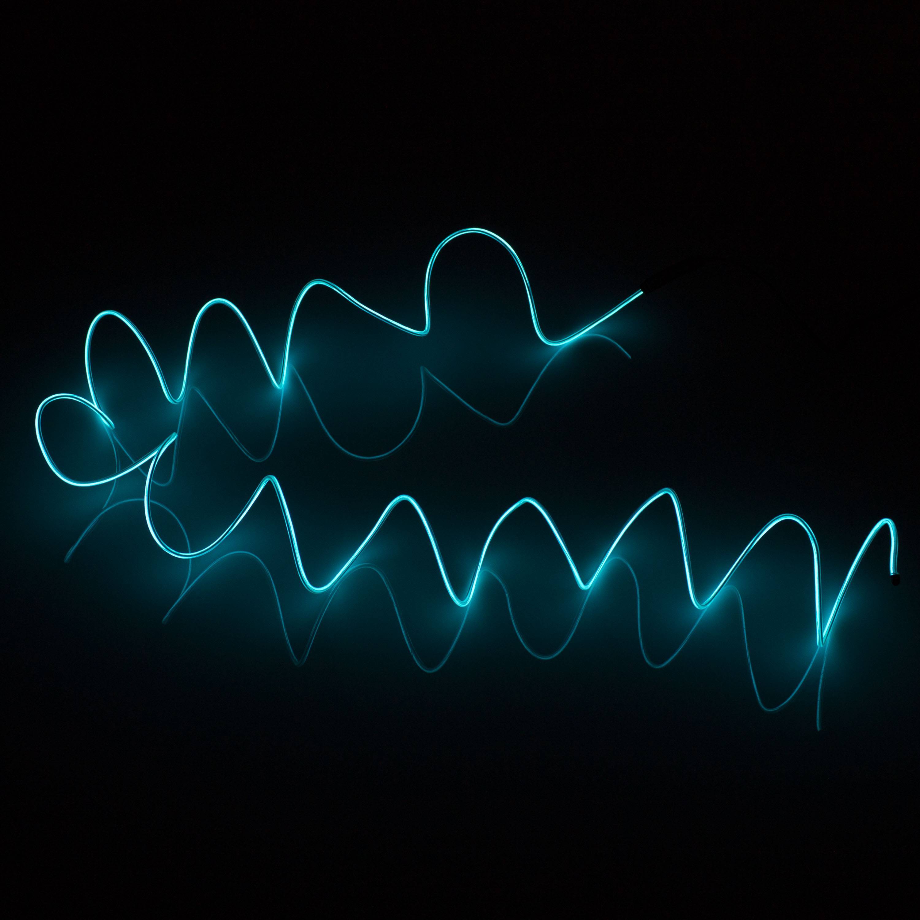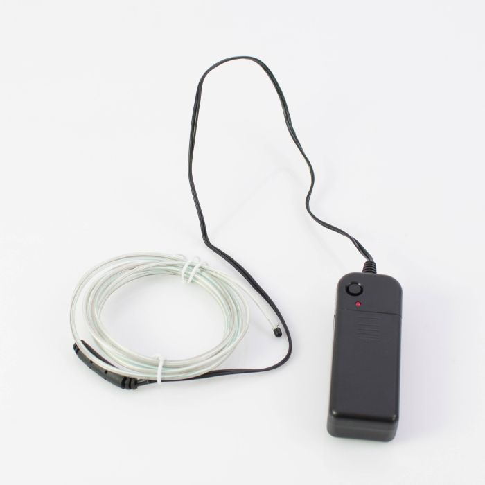 Hellblaues EL-Kabel mit 2 Metern Länge und 2 Milimetern Durchmesser. Mit dieser batteriebetriebenen Leuchte können Sie Ihr Partyoutfit, Kostüm oder Schaufenster dekorieren.