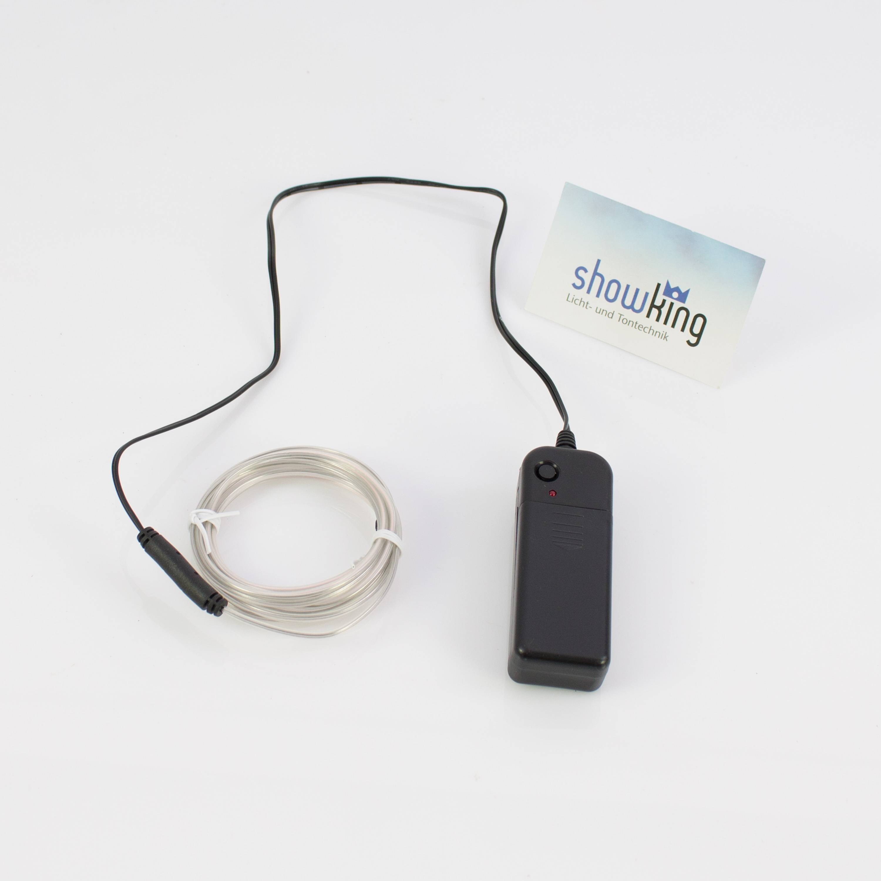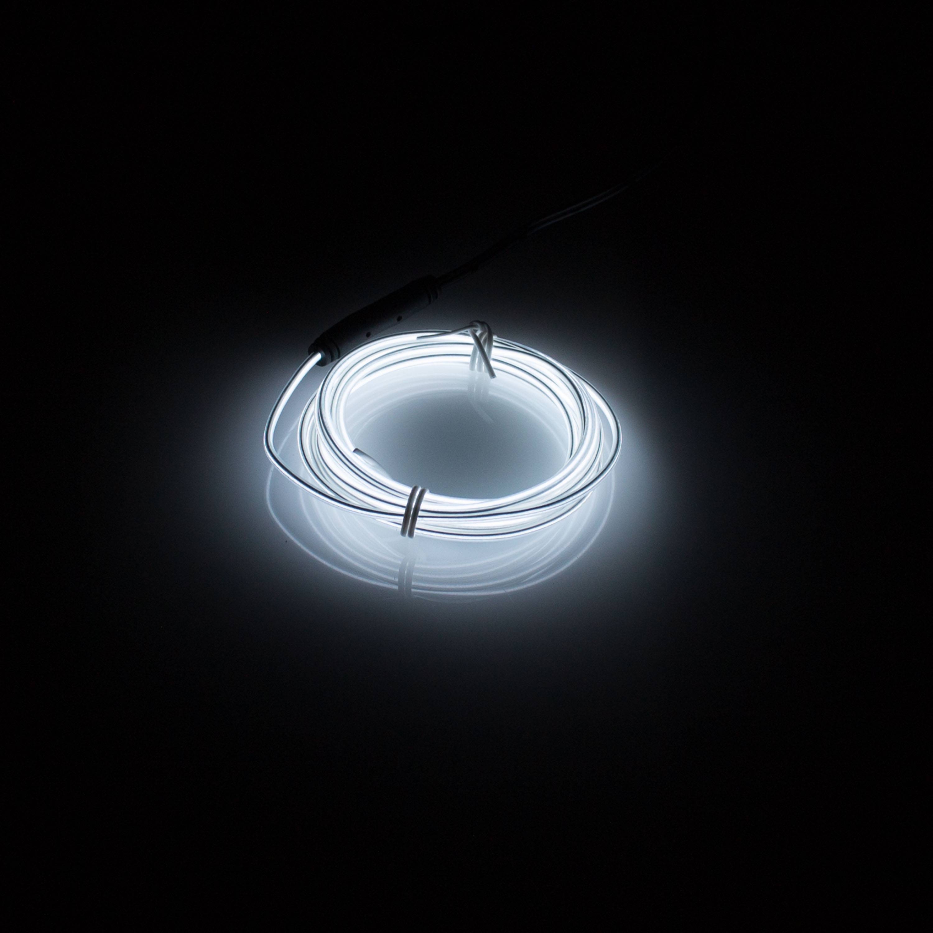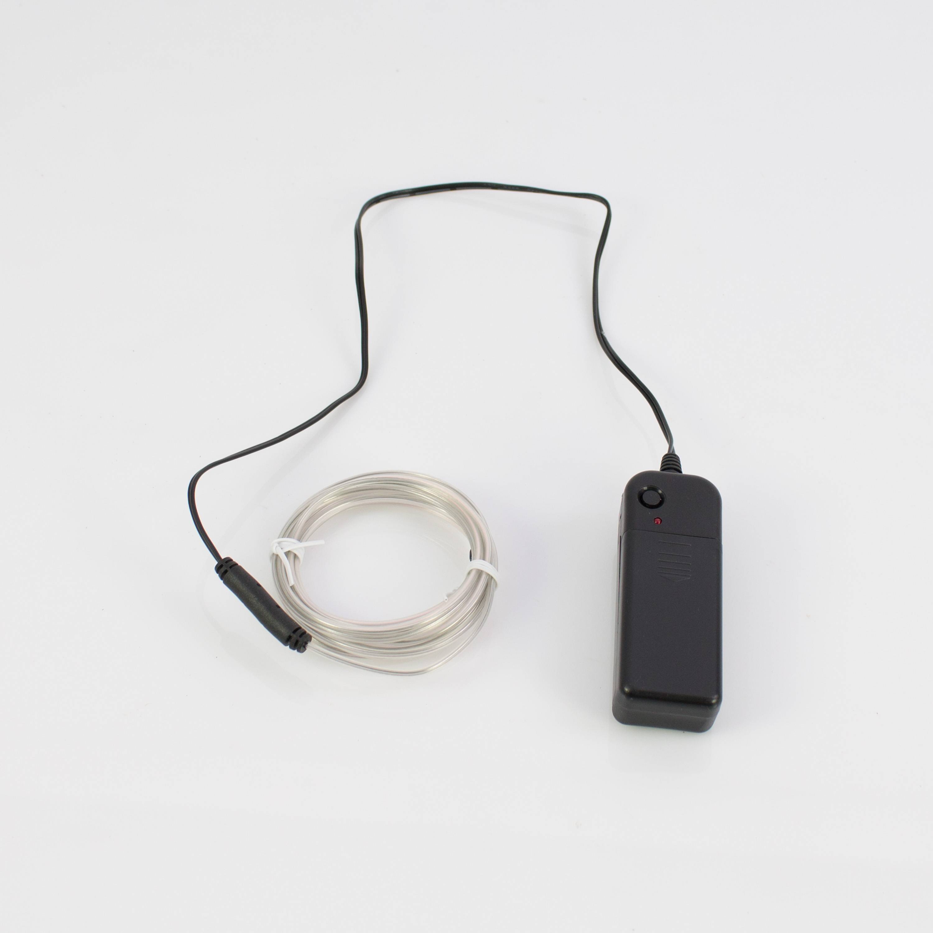 Kaltweißes EL-Kabel mit 2 Metern Länge und 2 Milimetern Durchmesser. Mit dieser batteriebetriebenen Leuchte können Sie Ihr Partyoutfit, Kostüm oder Schaufenster dekorieren.