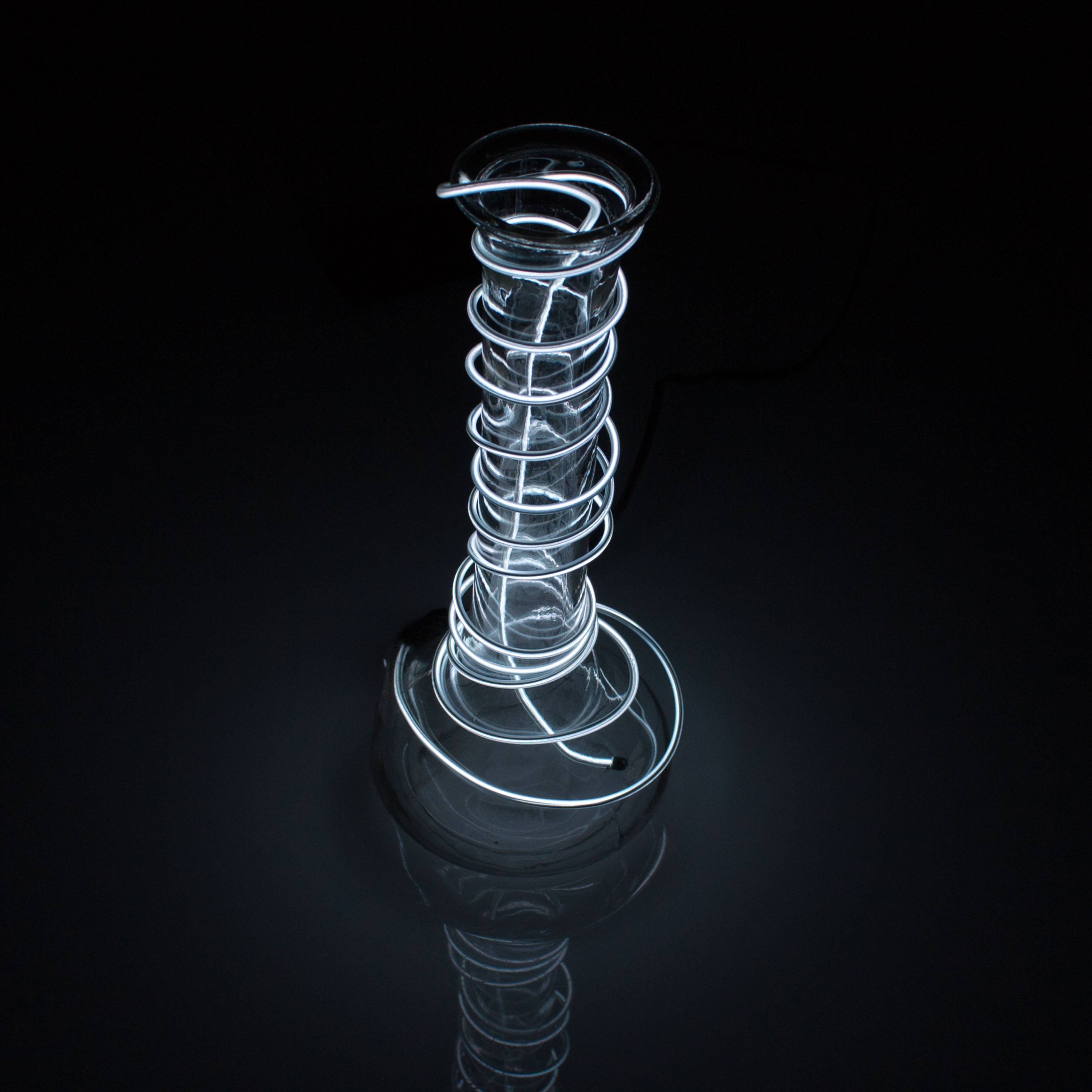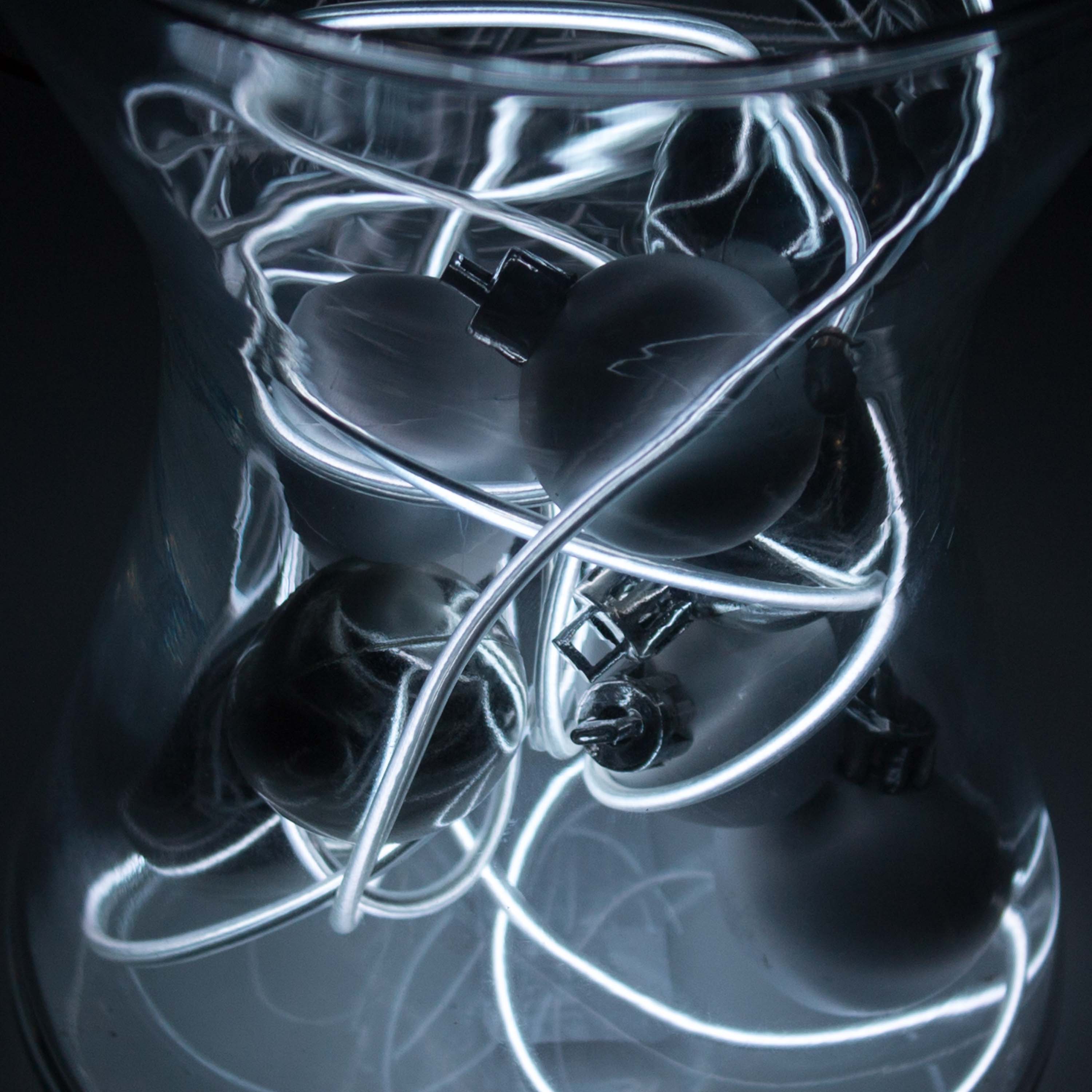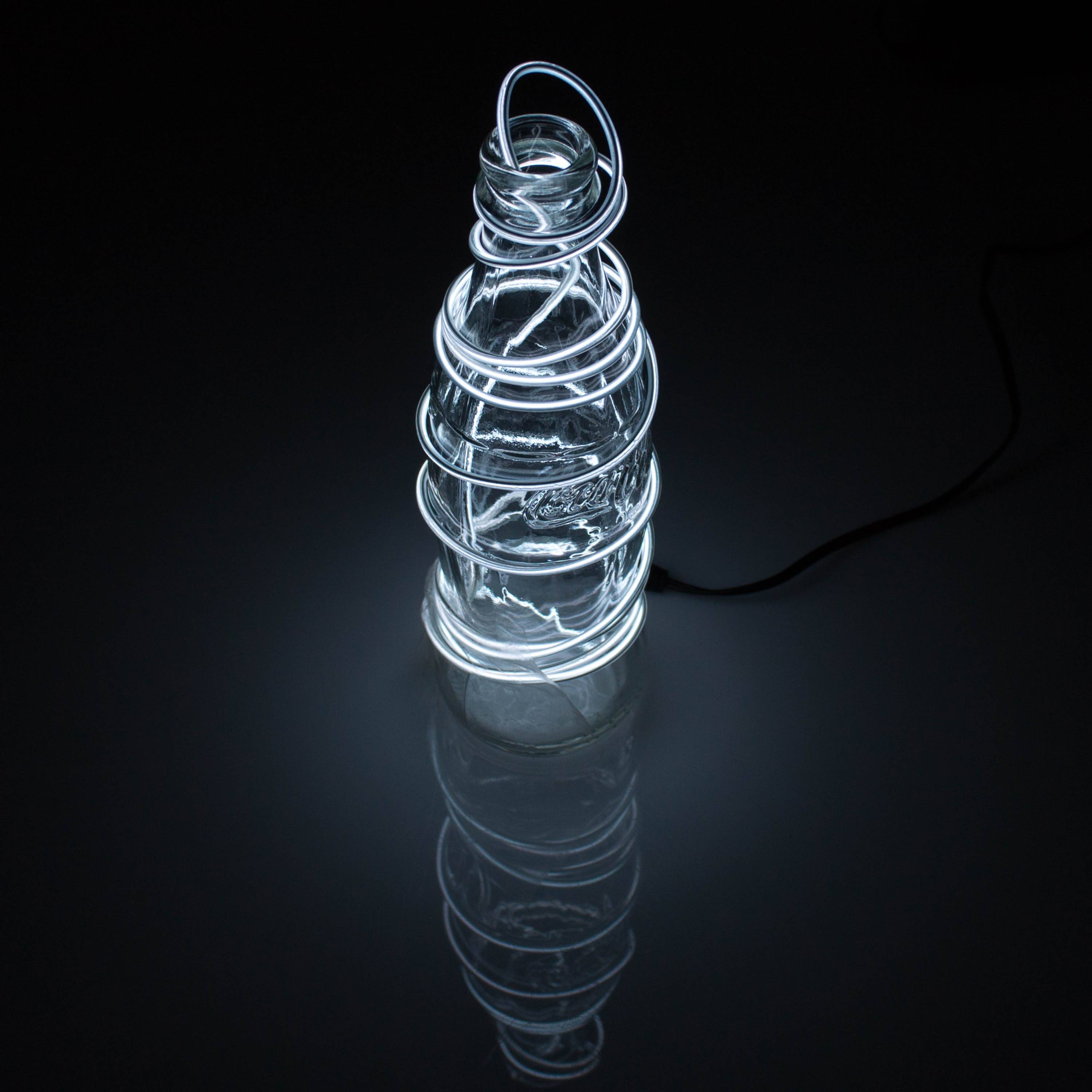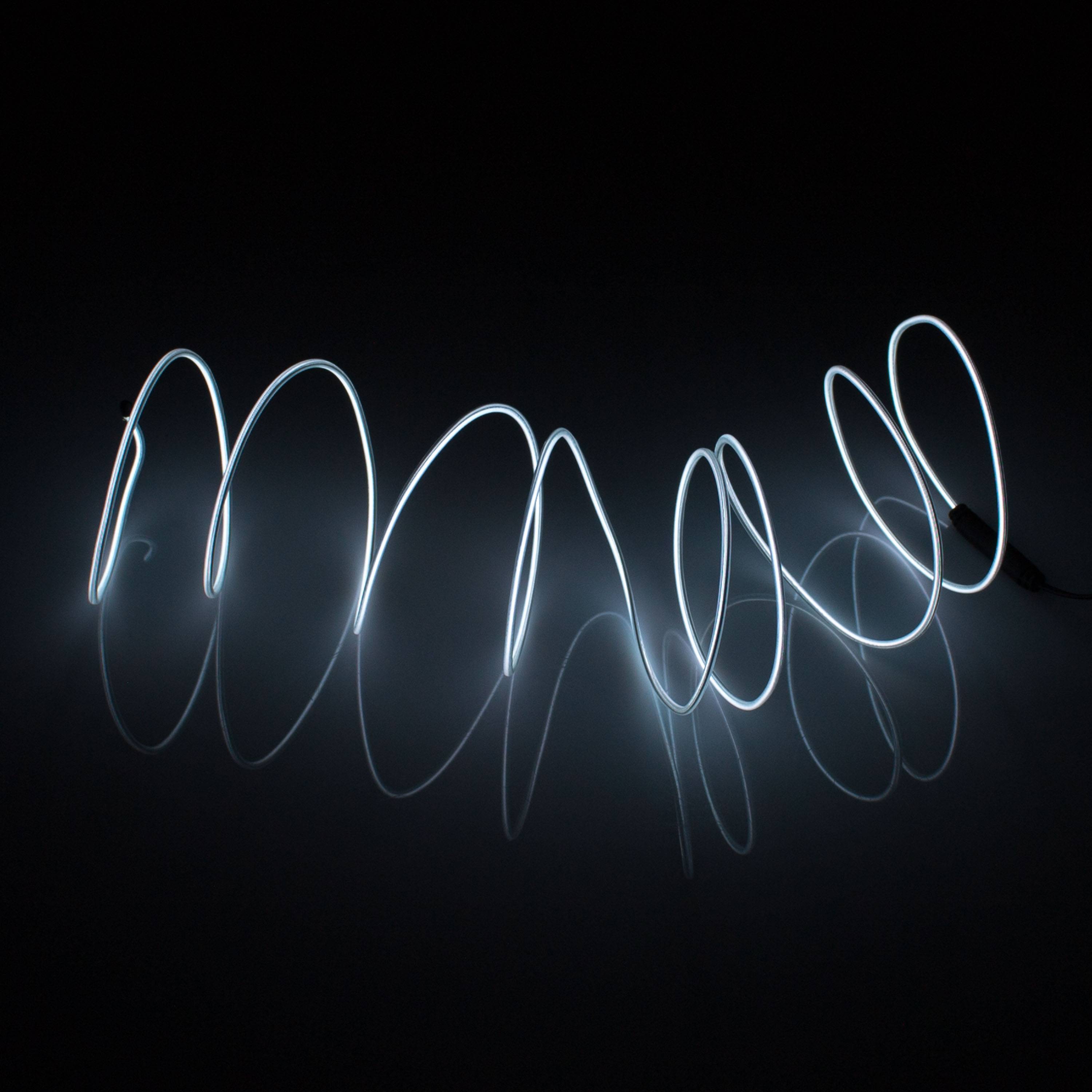 Kaltweißes EL-Kabel mit 2 Metern Länge und 2 Milimetern Durchmesser. Mit dieser batteriebetriebenen Leuchte können Sie Ihr Partyoutfit, Kostüm oder Schaufenster dekorieren.