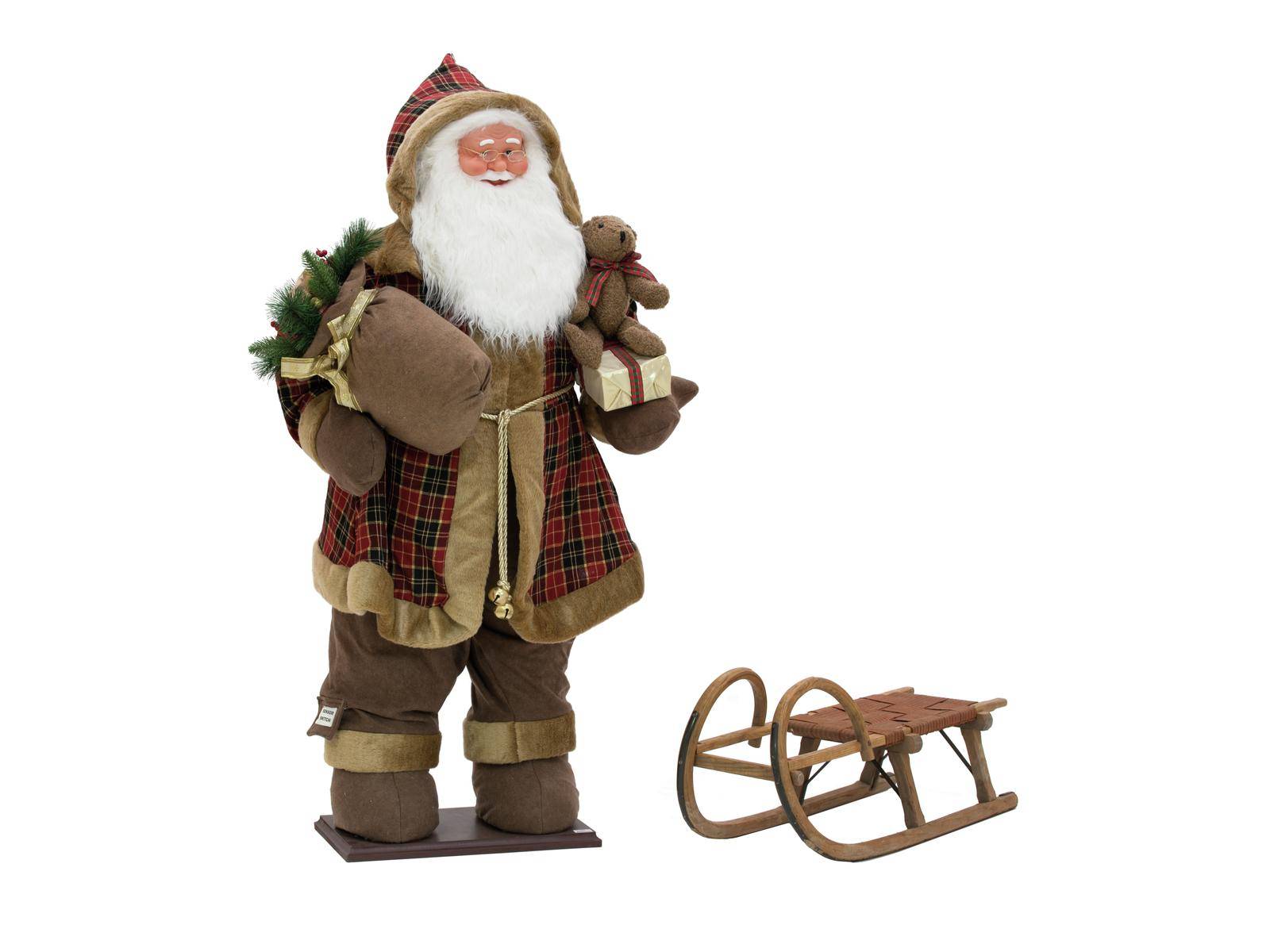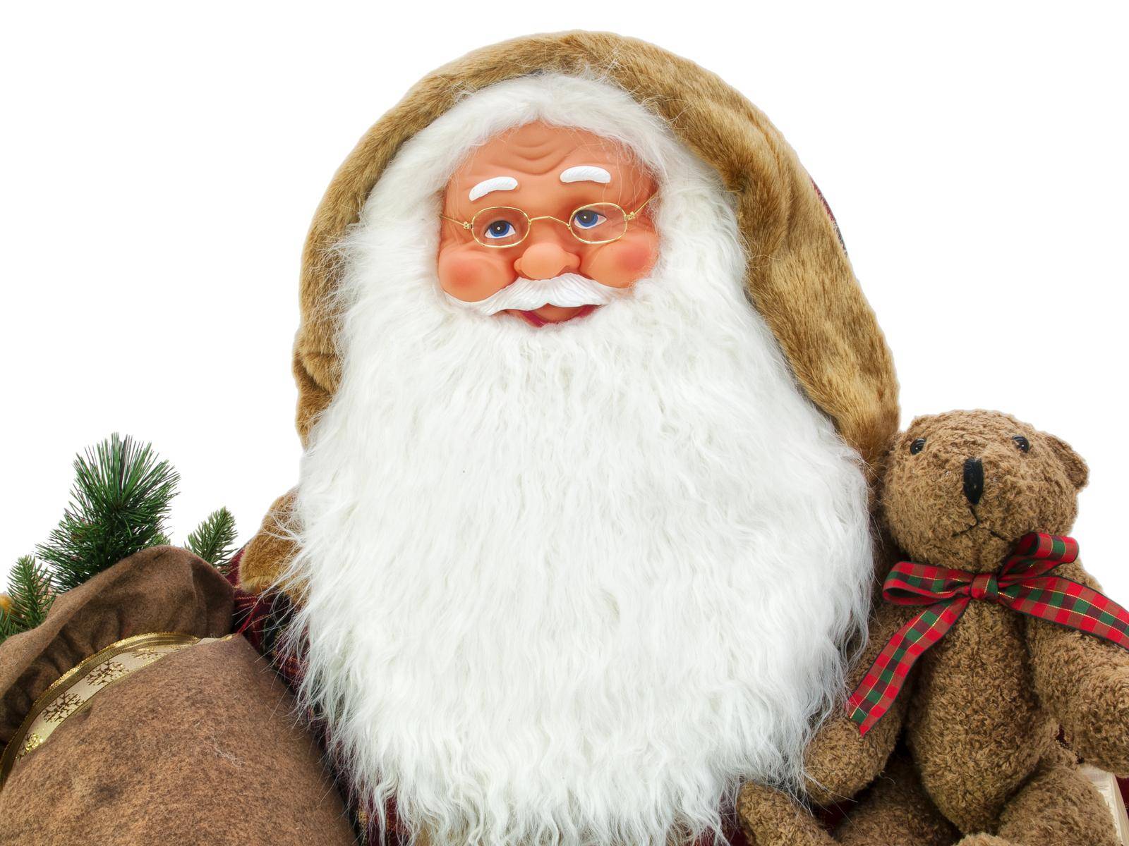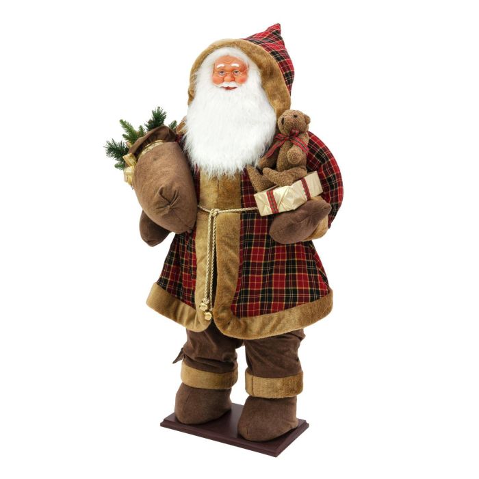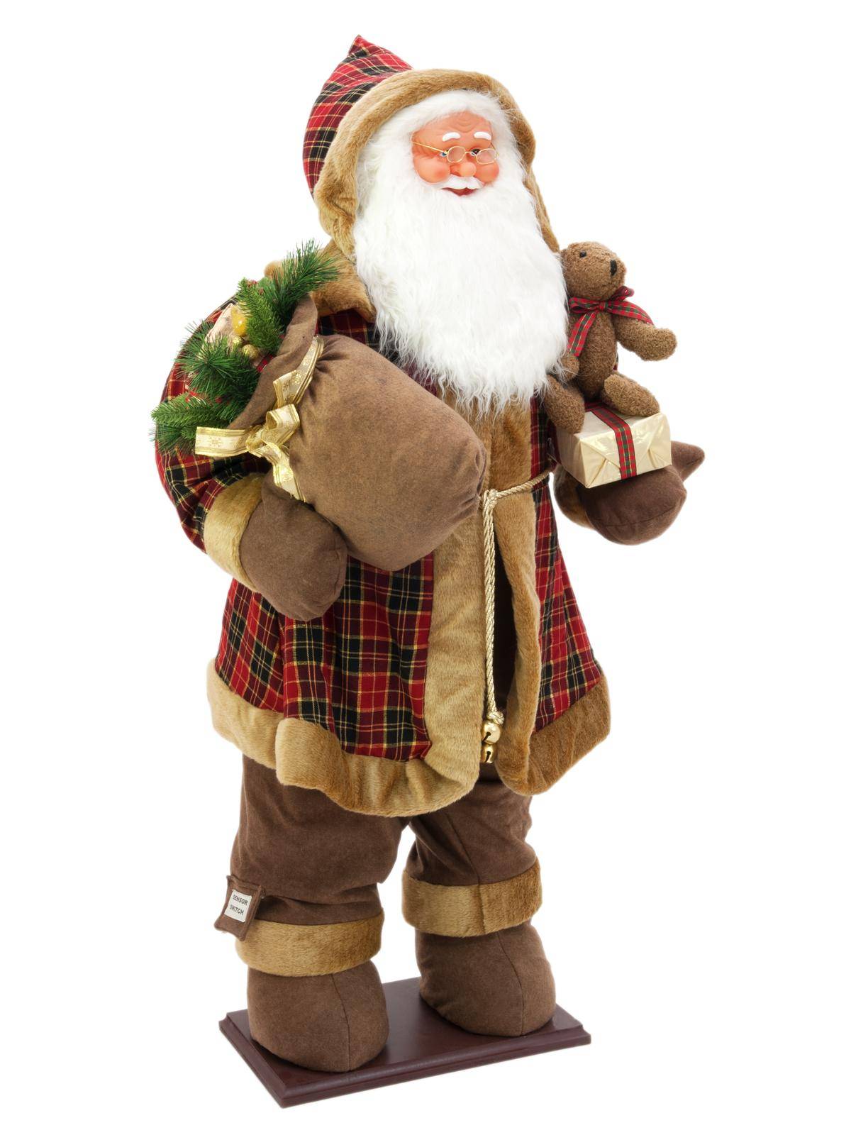 - Stehender Weihnachtsmann im karierten Mantel mit einem weißen Bart, geschmückt mit Geschenk, Teddy und Geschenkesack