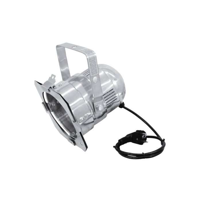 Stabiles PAR-Gehäuse aus Aluminium mit Haltebügel und hitzeisolierter Feststellschraube für Schaufenster, Showrooms und private Partykeller. PAR-Scheinwerfer für Leuchtmittel mit E-27 Schraubsockel, inklusive Farbfilterrahmen und Netzkabel.