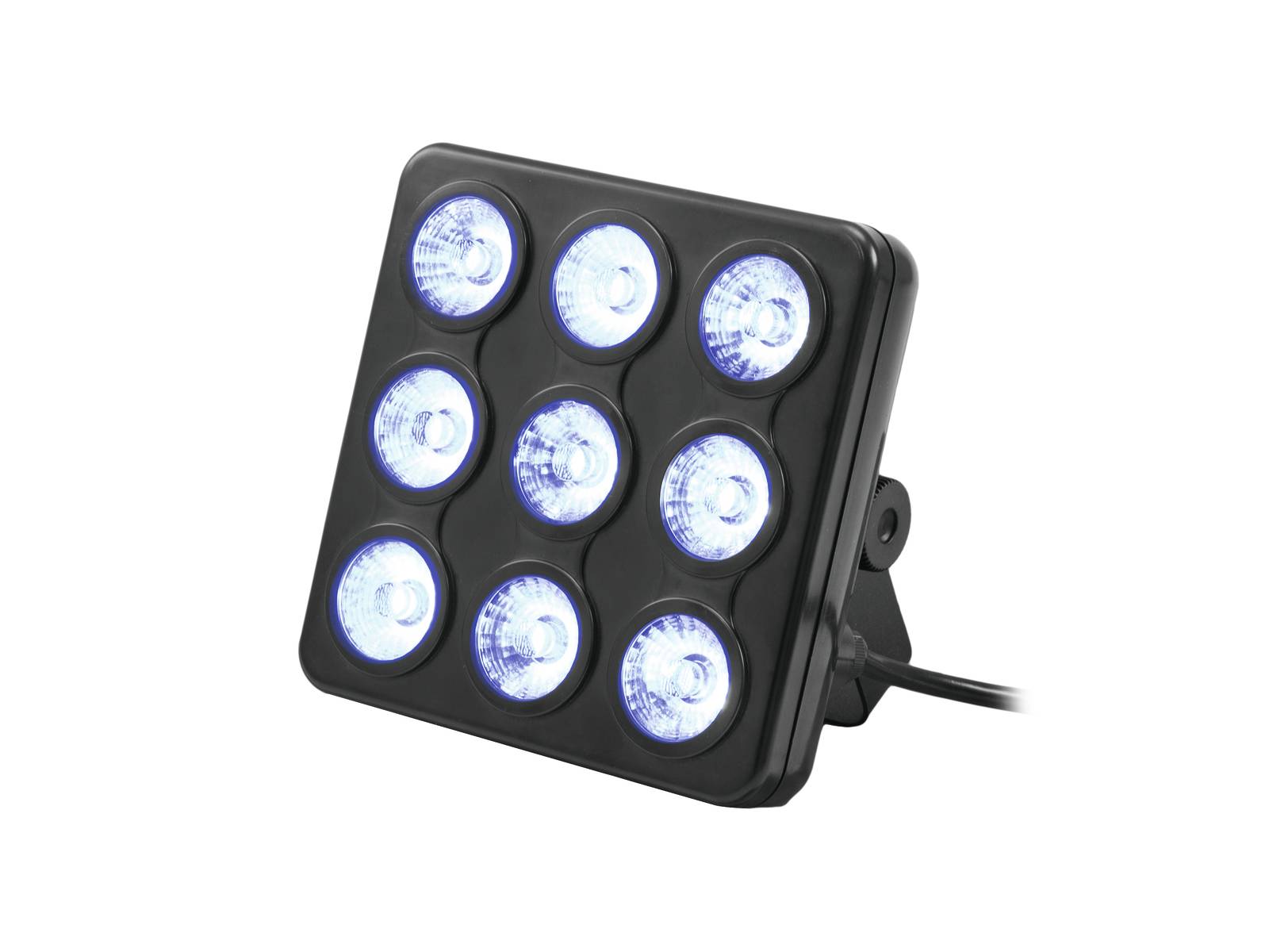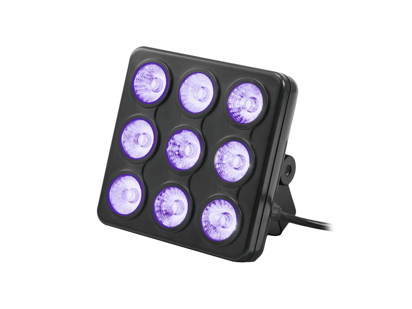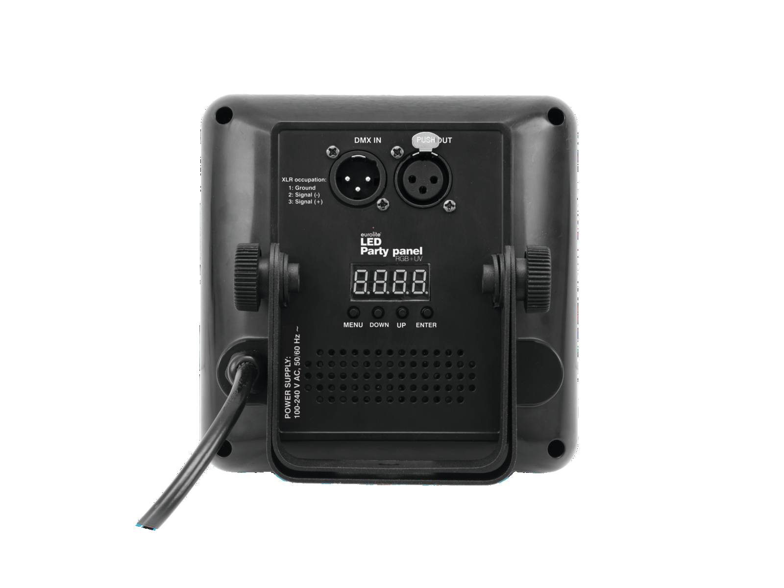 - Funktionen: Farbvoreinstellungen, stufenlose RGB+UV-Farbmischung, Farbwechsel mit diversen Einstellungen, Dimmer, Strobe-Effekt mit variabler Geschwindigkeit, Musiksteuerung über eingebautes Mikrofon, Master-/Slave-Betrieb