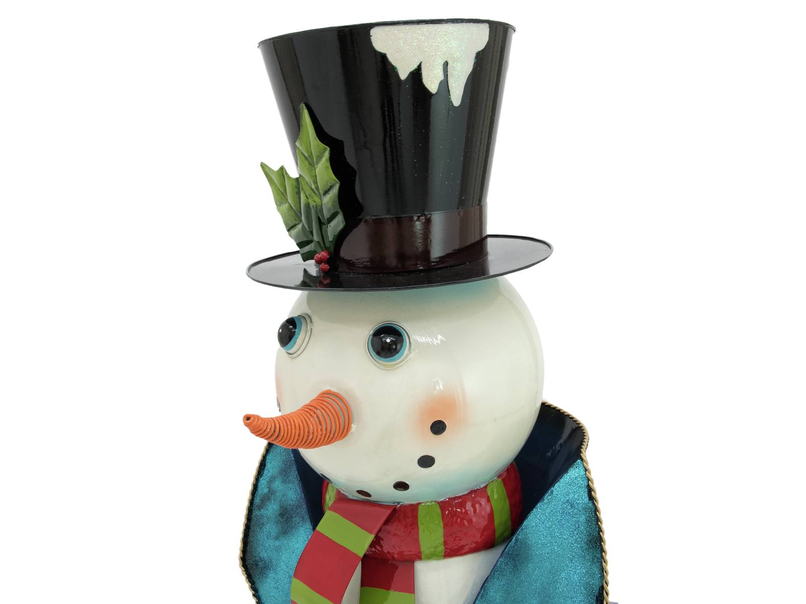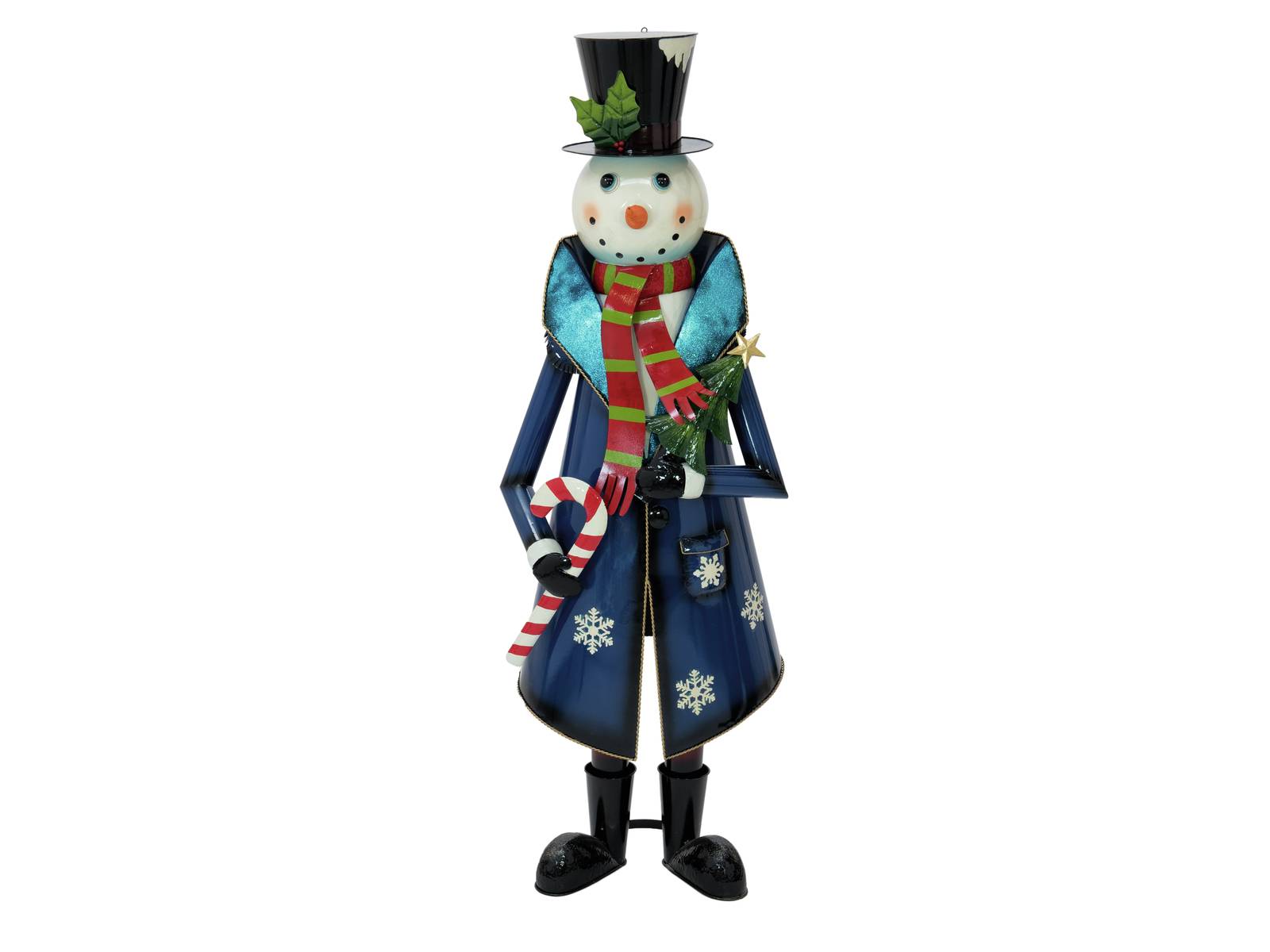 Die Schneefigur RUDIE aus Metall, ist in Handarbeit gefertigt und auf einer Bodenplatte befestigt.
