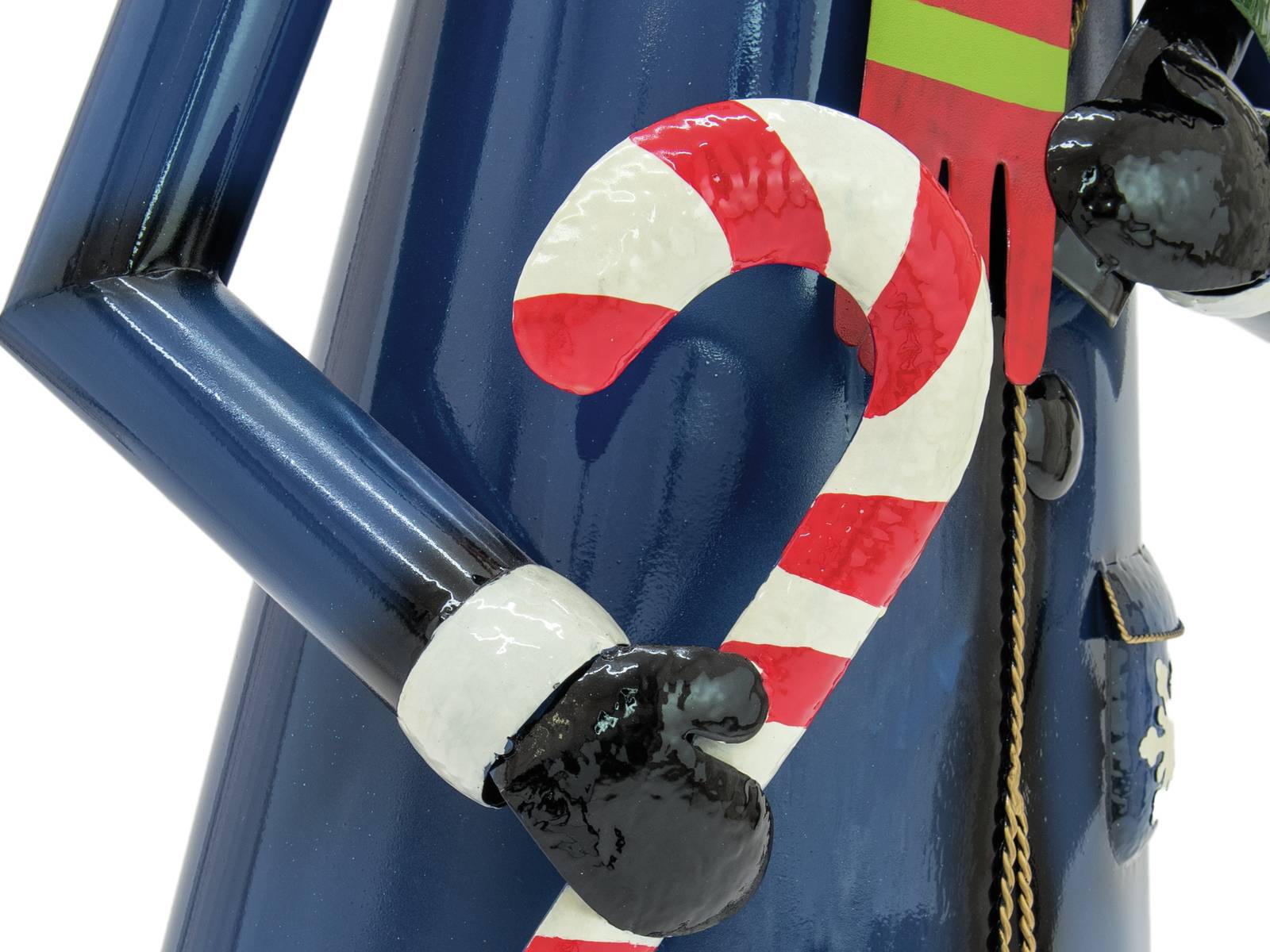 - Mit Mantel, Schal und Hut gekleidet und einer Zuckerstange und Tannenbäumchen in der Hand