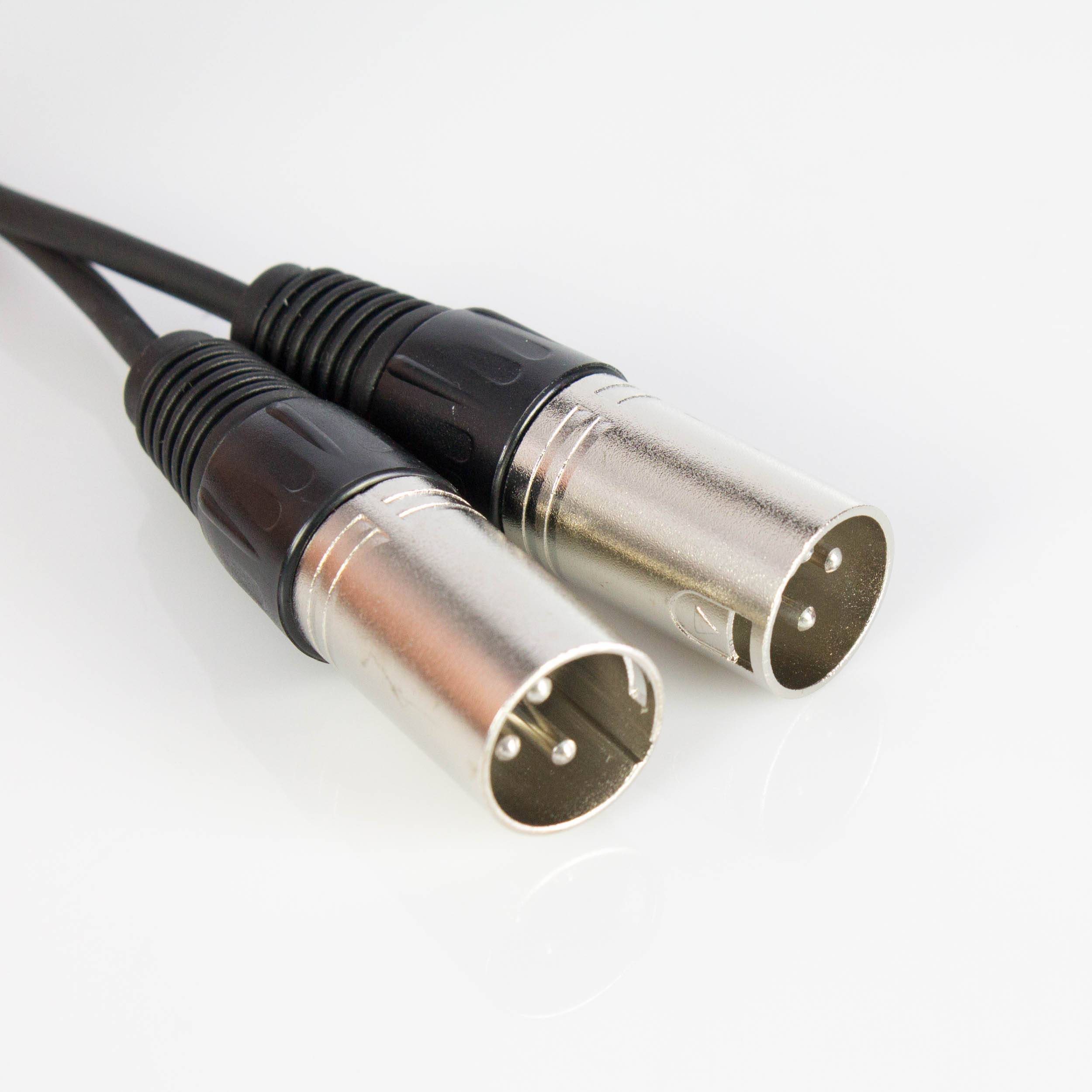 Adapterkabel das ein Stereo-Signal in zwei Mono-Signale aufsplittet. Das Audiokabel hat einen 3,5mm Klinkenstecker und zwei 3-polige XLR Stecker.
